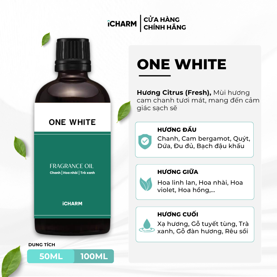 Tinh dầu nước hoa One White được iCHARM lấy cảm hứng từ nước hoa Ck One Calvin Klein. Với mùi hương cam chanh thơm mát, mang lại cảm giác tinh tế, cổ điển và tao nhã. Chúng thường sử dụng để khuếch tán tinh dầu, xông phòng giúp không gian trở nên sang trọng, đặc biệt hơn.