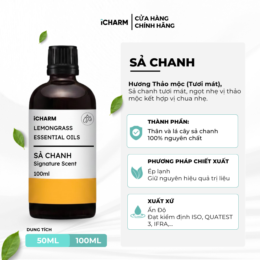 Tinh dầu Sả chanh iCHARM có tên tiếng anh là Lemongrass essential oils. Chúng mang đến mùi hương sảng khoái, tươi mát như hương thảo mát mẻ. Đây là loại tinh dầu phổ biến và thường được sử dụng liệu pháp hương thơm với nhiều mục đích khác nhau. Bao gồm cải thiện tâm trạng, giảm đau đầu, hoặc đuổi muỗi.