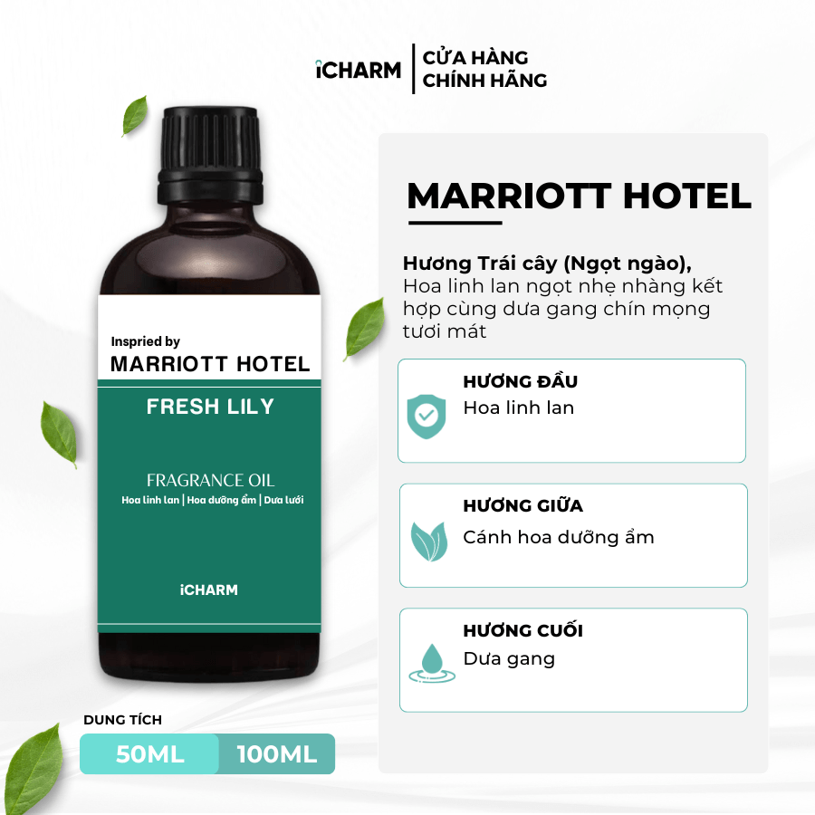 Tinh dầu khách sạn Marriott mang đến một hương thơm nhẹ nhàng và thư giãn. Hương đầu tạo ra một cảm giác nhẹ nhàng và tinh tế. Như là một dạo bước trong vườn hoa nở rộ. Hương giữa tạo nên cảm giác sảng khoái và tươi mới. Hương cuối tạo nên cảm giác thư giãn và thoải mái. Làm nổi bật sự mềm mại và tinh tế của hương thơm. Tạo nên một lớp hương cuối êm dịu và nồng nàn.